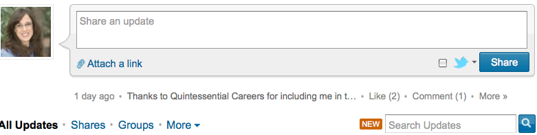 This search is sort of similar to searching a hashtag on Twitter, which shows you updates from everyone – not just your network – using that search term. LinkedIn aims to share “professional” updates with you via this tool, but this all depends on how your network or the network you are searching uses LinkedIn. Let’s face it, there are plenty of updates that are not exactly “professional.” I found many by searching only by city. However, in theory, this type of search should clue me in to what professionals in a given city are thinking and sharing. (Searches by industry are more focused and will likely produce useful results.)